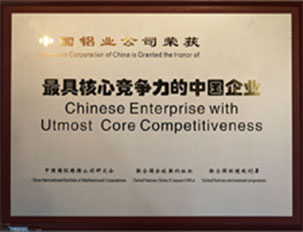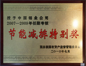 中國投資協會會員單位注冊證牌中國投資協會 中國紅十字勛章中國紅十字會會長華建敏 中國鋁業公司獲得金交易獎說明財務部 中國再生資源產業技術創新戰略聯盟理事長單位中國再生資源產業技術創新戰略聯盟 科技創新特別獎國資委 節能減排特別獎國資委 全國職業安全健康知識競賽優秀獎國家安全生產監督管理總局 信息化與工業化融合促進節能減排試點示范企業工業和信息化部信息化推進司 中國有色金屬加工工業協會第六屆理事會副理事長單位中國鋁業公司中國有色金屬加工工業公司 關于表彰中央企業2007-2009年任期業績考核業績優秀企業和特別獎獲獎企業的決定國務院國資委 榮譽證書[中國鋁業公司被評為2010年度有色金屬行業統計工作先進單位中國有色金屬工業協會 榮譽證書[中國鋁業股份有限公司被評為2010年度有色金屬行業統計工作先進單位中國有色金屬工業協會 |
