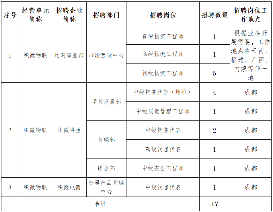 詳見附件1《成都積微物聯集團股份有限公司面向中鋁集團內部公開招聘崗位一覽表》