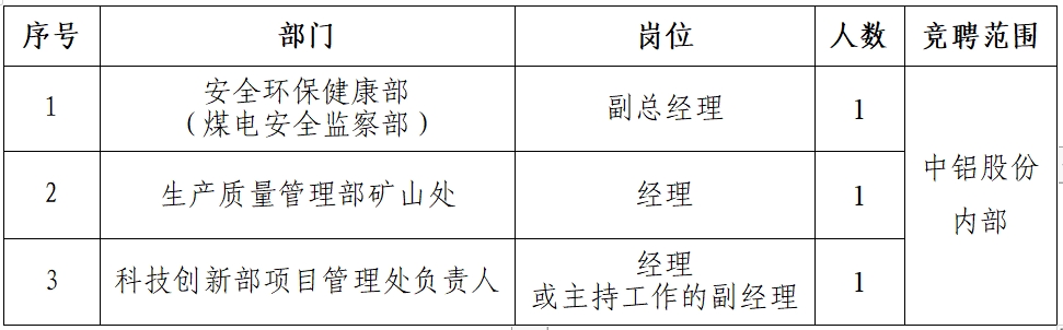 為打造經營能力和專業能力特強的經營單元本部,擬面向中鋁股份內部以競爭上崗方式選拔中鋁股份安全環保健康部副總經理1人,生產質量管理部礦山處經理1人,科技創新部項目管理處負責人1人。現就有關事宜公告如下: