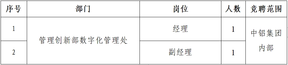 為打造經營能力和專業能力特強的經營單元本部,擬面向中鋁集團內部以競爭上崗方式選拔中鋁股份管理創新部數字化管理處經理和副經理各1人。現就有關事宜公告如下: