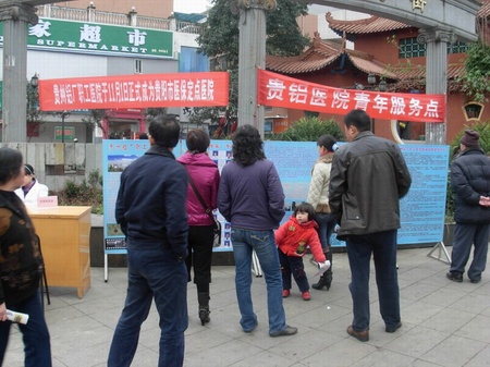 再次,開展“困難面前、我為醫院做件事”主題實踐活動。為了增加醫院的經濟效益,打開醫院的知名度,從11月15日開始,院團委組織各團支部、青年文明號集體利用周末休息時間,在白云區各個鬧市區以圖文展版、面對面介紹、發放宣傳資料的形式向過往群眾宣傳,同時開展一些義診服務,如免費測血壓、疾病咨詢等,共接待疾病咨詢600余人、醫保咨詢900多人、免費測血壓近千人次、發放宣傳資料1400多份。